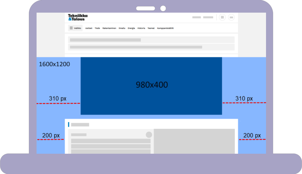 - Mainoksen ydinviesti tai kehote tulee sijoittaa paraatin yhteyteen, ja ydinviestiä tukeva viesti kannattaa sijoittaa tapetissa lähelle sisällön reunaa (safe area, 160 pikseliä leveä). Pienemmillä näyttöresoluutioilla osa tapetista jää piiloon, tästä syystä kaikki elementit, joiden halutaan kokonaan näkyvän, tulee sijoittaa maksimissaan 160 pikseliä yli sisällön reunan. Tapetti näytetään jos käyttäjällä on vähintään 1440 pikselin levyinen näyttö.